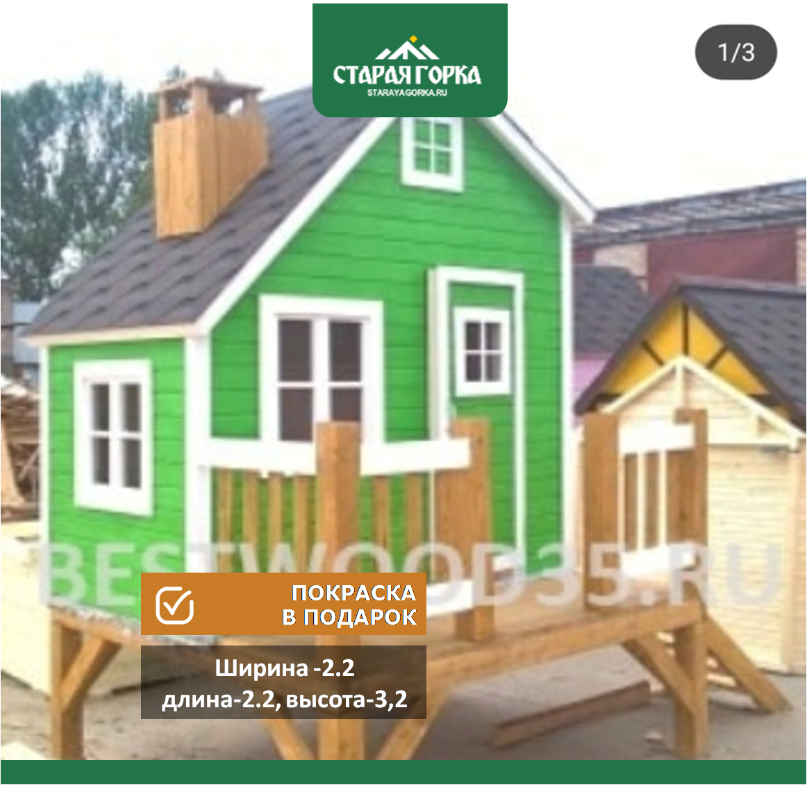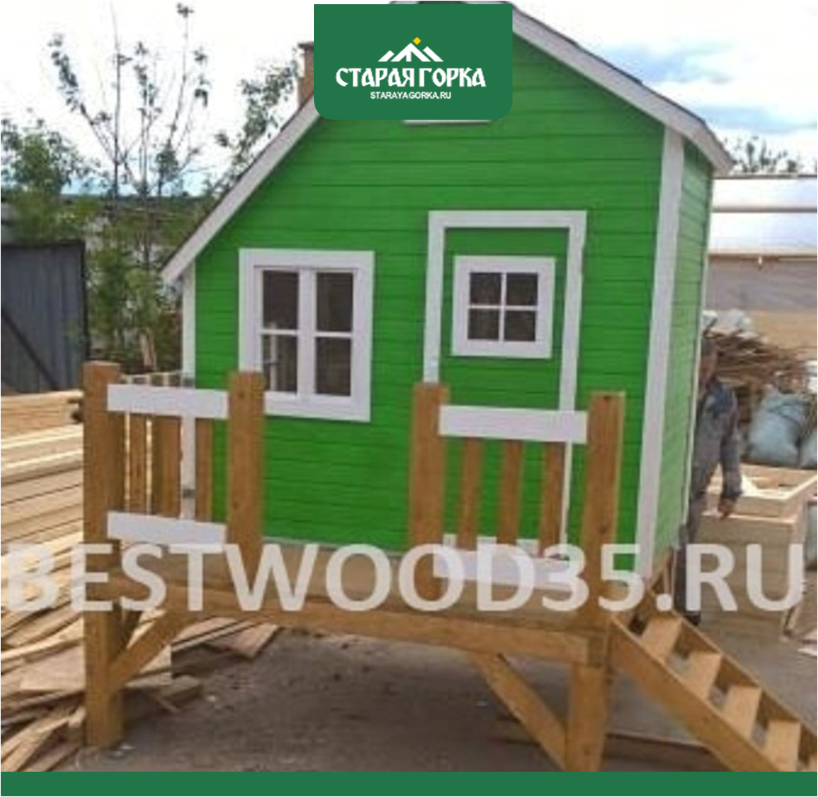 Обвязка - 100*30 мм. Лаги пола - доска 100*30 мм. Пол - доска строганная 20*95 мм. Каркас стен - доска 45*45 мм. Стропила - брусок 45*45 мм. Обрешетка - сплошная из вагонки. Карнизы, наличники, подшивка свесов крыши - доска сухая строганная 15*80 мм. Горка пластиковая.